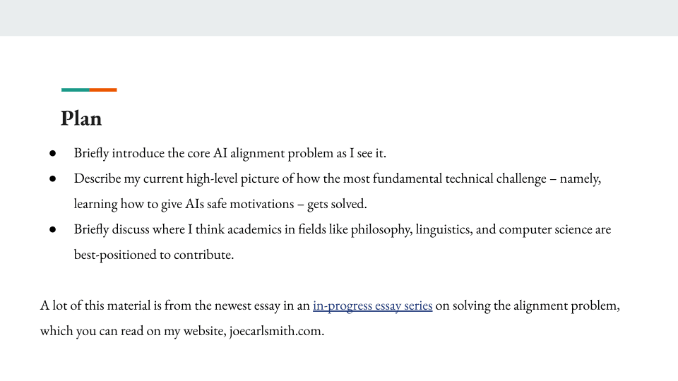 I'm going to briefly introduce the core AI alignment problem as I see it. It's going to be a particular version of that problem, the version that I think is highest stakes. And then I'm going to talk about my current high-level picture of how that problem gets solved at a technical level. There's a bunch of aspects of this problem that aren't the technical level that are also crucially important, but I'm going to focus on the technical dimension here. And in particular, the dimension focused on the motivations of the AI systems that we're building. That also is not the only technical dimension. There's also technical aspects to do with constraining the options and monitoring and oversight for what AIs can choose to do. But I'm focusing on what are their options, how do they evaluate the different options available.