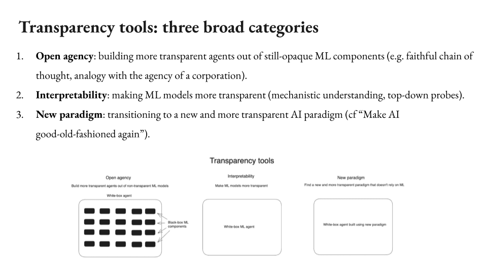 One I'm calling open agency, which is basically building more transparent agents out of still-opaque ML systems. So it's sort of leaving the opacity of ML systems as a constraint, but nevertheless, trying to build agents using these opaque black boxes out of them such that it's still nevertheless transparent at some higher level of abstraction to a degree necessary for safety.