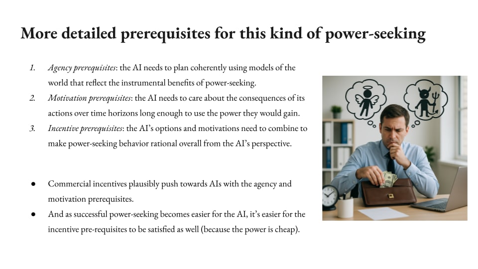 And I'll just point, so on the third thing, the incentive prerequisites, I think, does matter a lot. I think the worry there is that as then power becomes easier and easier for the system, it becomes easier and easier for these prerequisites to be satisfied. So if you imagine, it's like AI or this employee is like it's more... it's just sitting there. You just take the money from the company with total impunity or something like that. It's just free. It's incredibly easy. There are a zillion ways he could do it. He could do it in ways that don't even involve lying. He could do it. And there's just like, the more paths with higher probability are open for getting a given sort of power, then the easier it is for a given agent with a given pattern of motivations to choose to pursue that path. And the worry is that as the asymmetry and power between AIs and humans grows, that becomes more and more the case.