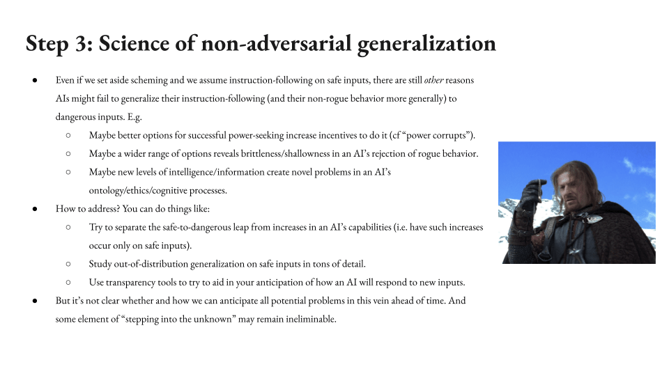 So that's basically, if you're improving an AI's capabilities, never have that improvement occur at the same time as you're now giving the AI options to take over the world. First, improve its capabilities safely in a context where it cannot take over the world, study it in depth, and only then, deploy it in a way that would give it a dangerous option. And then finally, you can try to use transparency tools. I think this one, I'm not sure how hard this will be, but I do feel like most at sea in terms of thinking about how we would address this one. And so I'll just flag that.