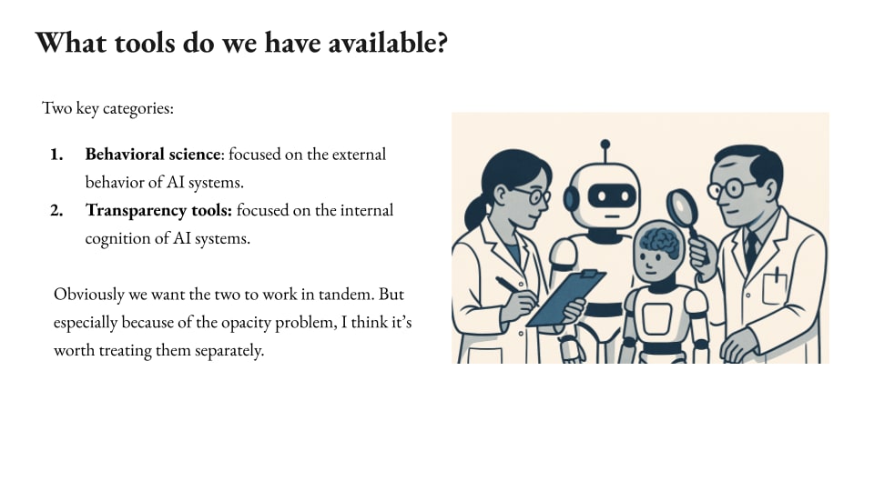 One is we study the behavior of the systems. We leave the opacity issue unresolved, review the AIs from the outside, but we study the behavior in depth. I'm calling that behavioral science.