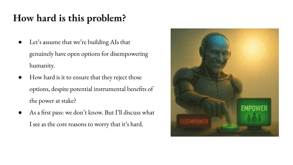 Okay, so that's the broad sort of concern here. How are we doing? Okay, well, let's see how much of this we get through. Okay, so let's assume we have some systems that are in a position to take over the world, in a position to disempower humanity. And let's assume that they're at least agentic in the sense I just described that they have long-term motivations of some kind that are focused on. So they're sort of candidates for this sort of behavior. How hard is it to ensure that they reject the option to pursue human disempowerment? That's the question I want to look at.