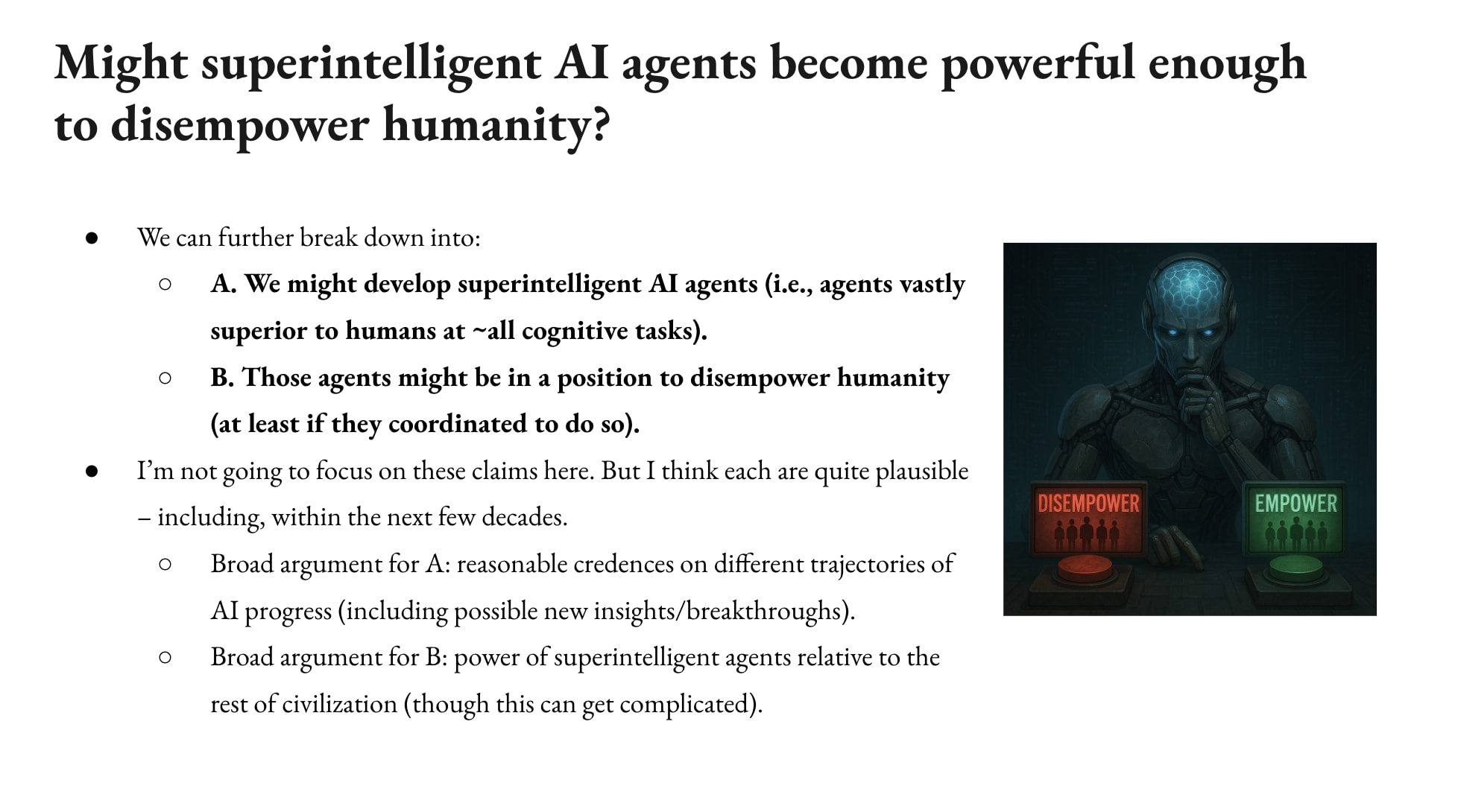 The classic version of this disempowerment is extinction. I don't think that's actually the central thing we need to focus on. Is the disempowerment premise that counts. So that's the first premise is that there's going to be superintelligent AI agents where this is, in some sense, an option for them. And the second premise is they might be motivated to pursue that option once it is available. So that's the core concern.
