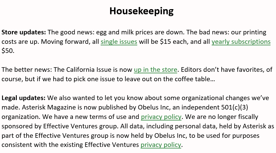 Like Karthik, I don’t really understand what is so terrible about this, but I agree that the California edition is at least strange. It’s interesting how many of the ideas central to EA originate from California. While exploring the origin stories of these ideas is intriguing, I would be much more interested in an issue that explores ideas from far outside that comfort zone and see what they can teach us.