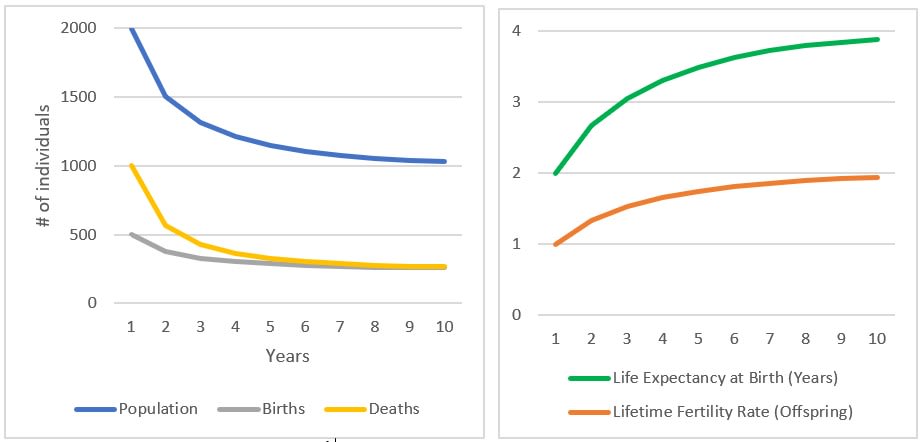 Now suppose we sterilise half the females.[3] The birth rate drops to 500 per year initially, while the death rate remains similar. The population drops, which soon improves the survival rate, as food becomes more abundant. The number of deaths drops (while lagging slightly behind the falling birth rate). The population ultimately stabilizes at half its initial size. The life expectancy doubles, which means that the lifetime fertility rate rebounds to 2.[4]