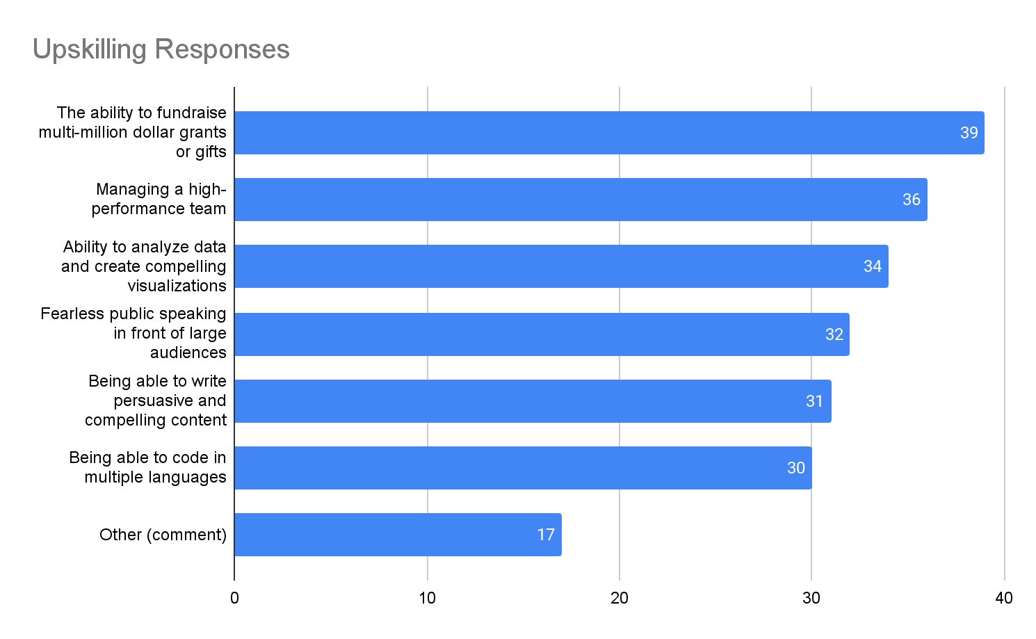 The survey also asked about broad skill areas in which respondents would like to attain expert-level knowledge. The objective of this question was to understand where individuals might invest their time in learning something new, rather than their perceptions about which skills were marketable or useful to the job search. Because responses were nearly evenly distributed with a high number of “Other” responses, the results were inconclusive and are included in the Appendix.