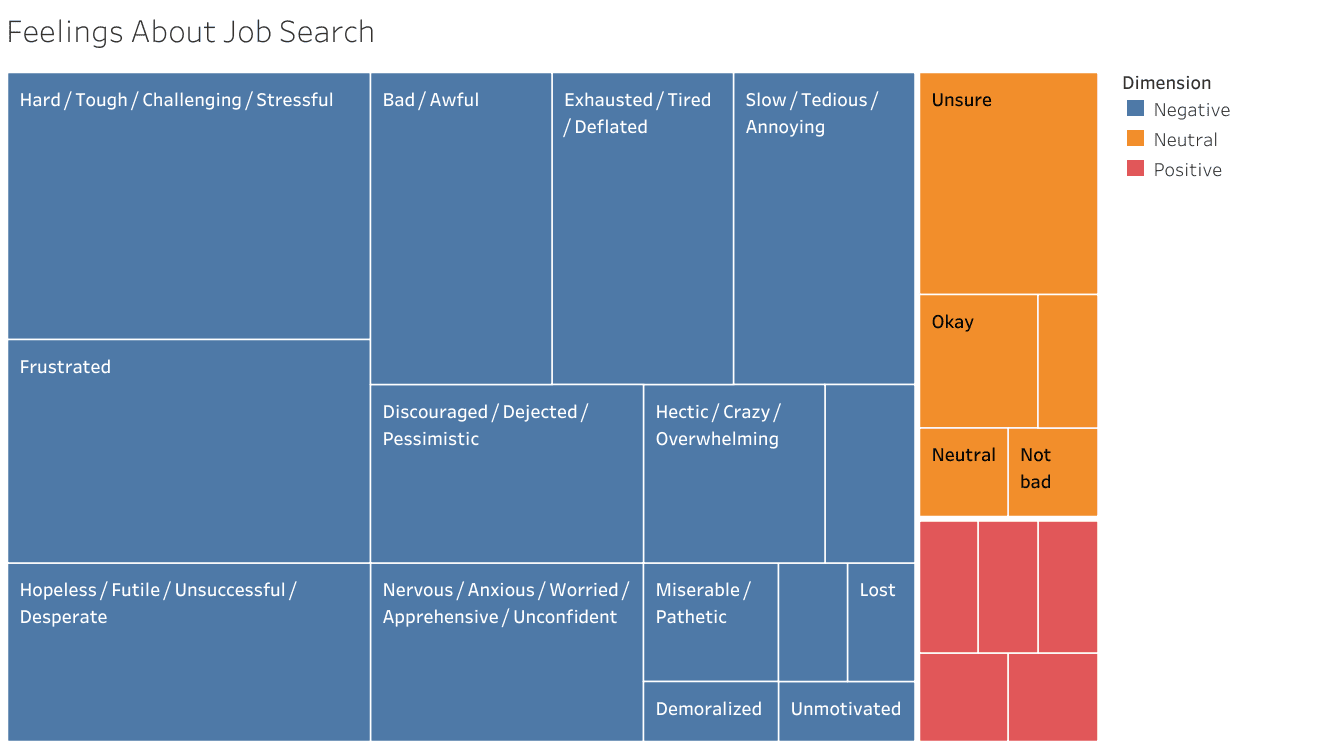 - Self-reported perceptions about their job search are overwhelmingly negative, with 89% of survey respondents citing negative feelings such as stress, frustration, and hopelessness.