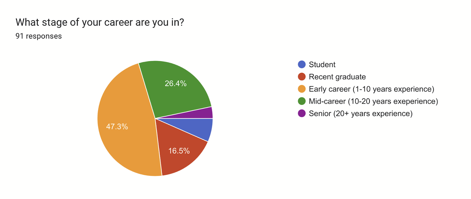 Nearly half (47.3%) of respondents were early-career professionals with less than 10 years of work experience (Figure 1). The second largest group were mid-career professionals (26.4%), followed by recent graduates (16.5%), students (6.6%) and senior professionals with 20+ years work experience (3.3%).
