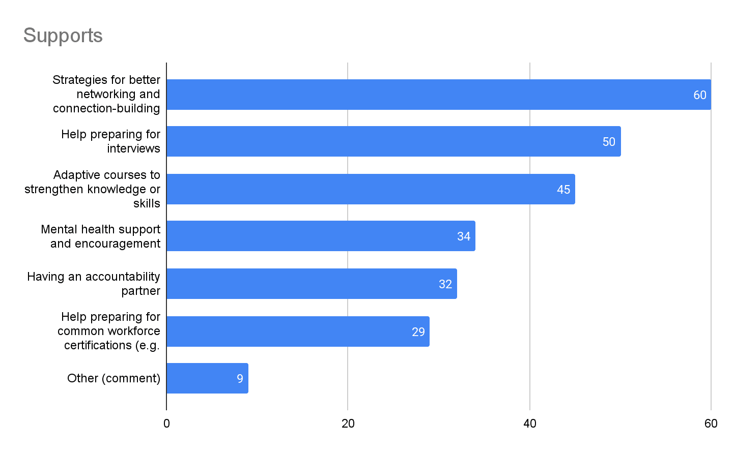 There were 9 comments in the “Other” field, but no clear themes emerged. The following topics were mentioned: a need for support with finding mentors (2 mentions), help searching for the right roles, grants to pay for additional training, peer groups, and understanding labor market needs. Three of the “Other” responses were aimed at employer organizations and academic institutions: reduce ageism, provide more volunteer positions, and provide more career planning support to students while in college.