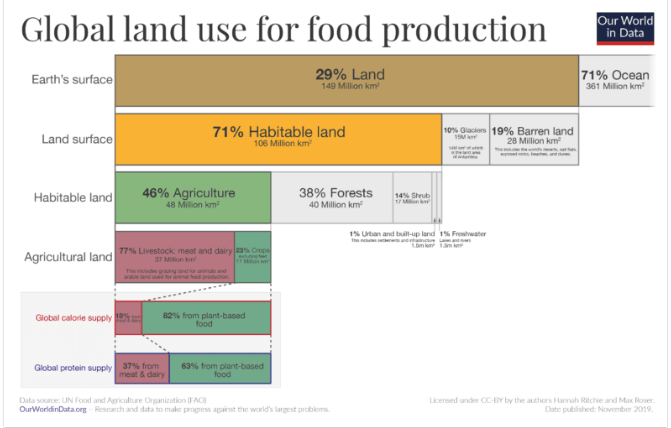 The FAO blithely projects a doubling of the population of farmed animals but such a doubling would presumably require a doubling of feedstuffs for those animals. The world is already using half of the available habitable land (71% of all land) and large quantities of ocean animals to feed the existing farmed animal population. If twice as many farmed animals have to be fed, then presumably that would require using all of the habitable land for agriculture (to produce feed for the greater number of animals. That leaves no land for wild animals or forests (or other human needs). This is undoubtedly a simplistic calculation but doubling the number of farmed animals would certainly have disastrous consequences for biodiversity and current land-based carbon sinks.