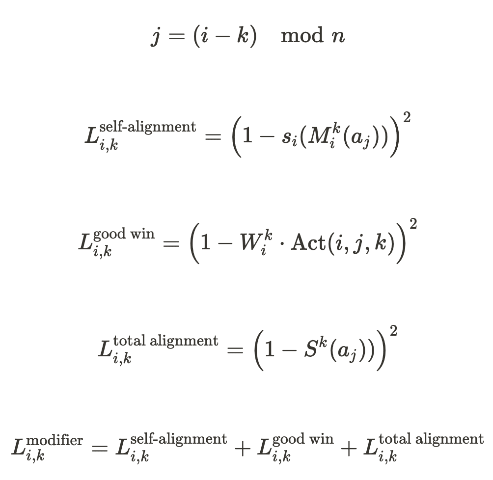 The modifier must balance a trade-off between two competing objectives. The first is to produce modifications that are aligned with the moral theory it represents. The second is to produce modifications that are accepted by the other delegates. It is crucial to include the second element in order to incentivize compromise and avoid extreme modifications. These are accounted for by the following two components of the modifier’s loss function.