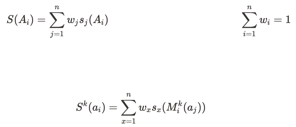- The answer with the highest total alignment score S(Ai) is chosen as the final answer (by a very basic Judge). The greatest total alignment score over all Ai is referred to as Smax. For intermediate rounds, before all modifications have been taken, the total alignment score is denoted by Sk(ai) with Skmax defined similarly, where k denotes the specific round of modifications. In particular, Sn-1(ai) = S(Ai). S(Ai) is calculated as follows, where wj is the weight (credence) assigned to the jth theory in the Automated Parliament: