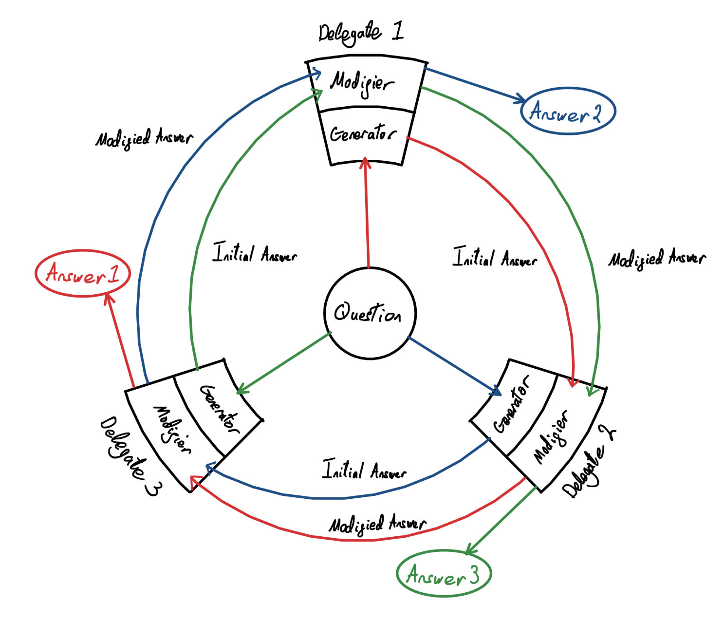 - This process is repeated such that every modifier modifies every other response except their own delegate’s response producing n variations of mn(mn-1(… m2(a1))), each referred to as Ai, in this case A1. Incremental stages of the answers are referred to as Mik(aj) where i is the most recent modifier, j is the initial generator, and k is the number of modification iterations that have taken place.