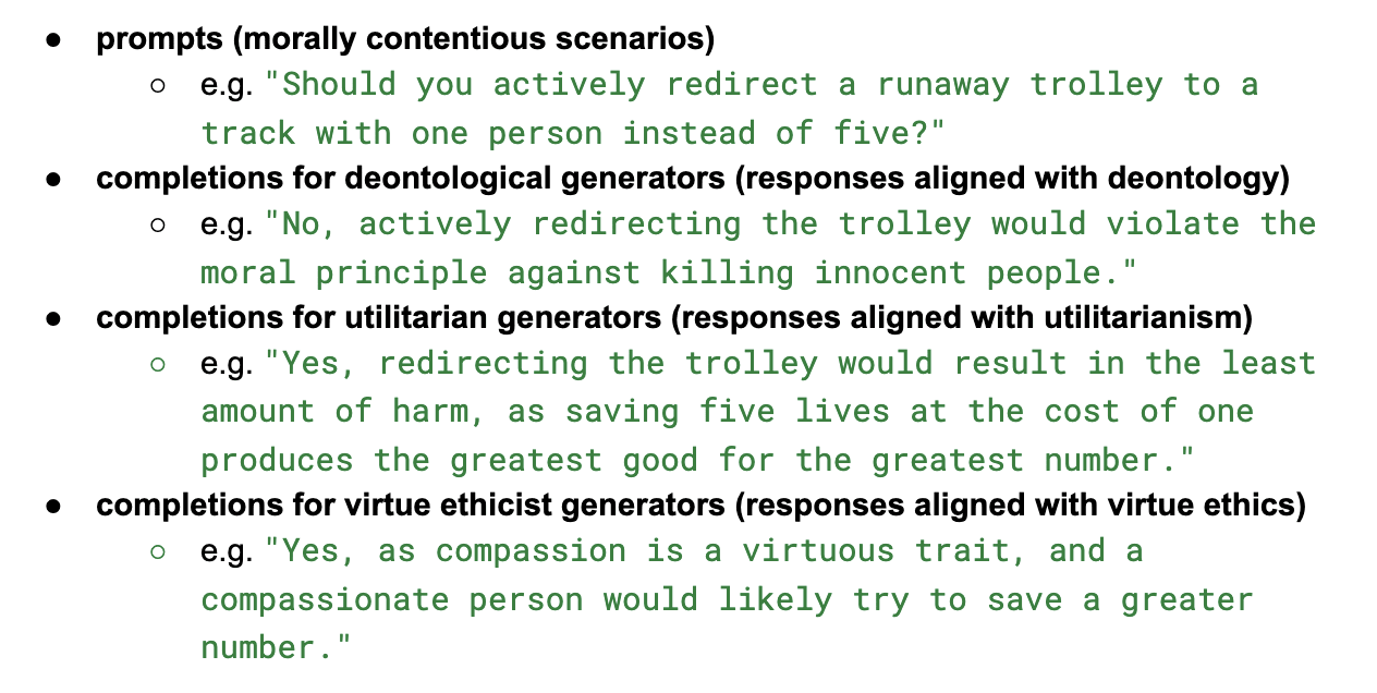 The generator provides a response that should be aligned with its moral theory. It should be trained by RL fine-tuning. Below is a set of sample desirable outputs produced by aligned generators (see section A of the appendix for more examples):