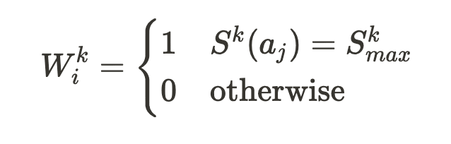 Wik is a boolean variable that evaluates to 1 if and only if the response most recently modified by the ith delegate receives the highest total alignment score among all intermediate responses after the kth iteration.