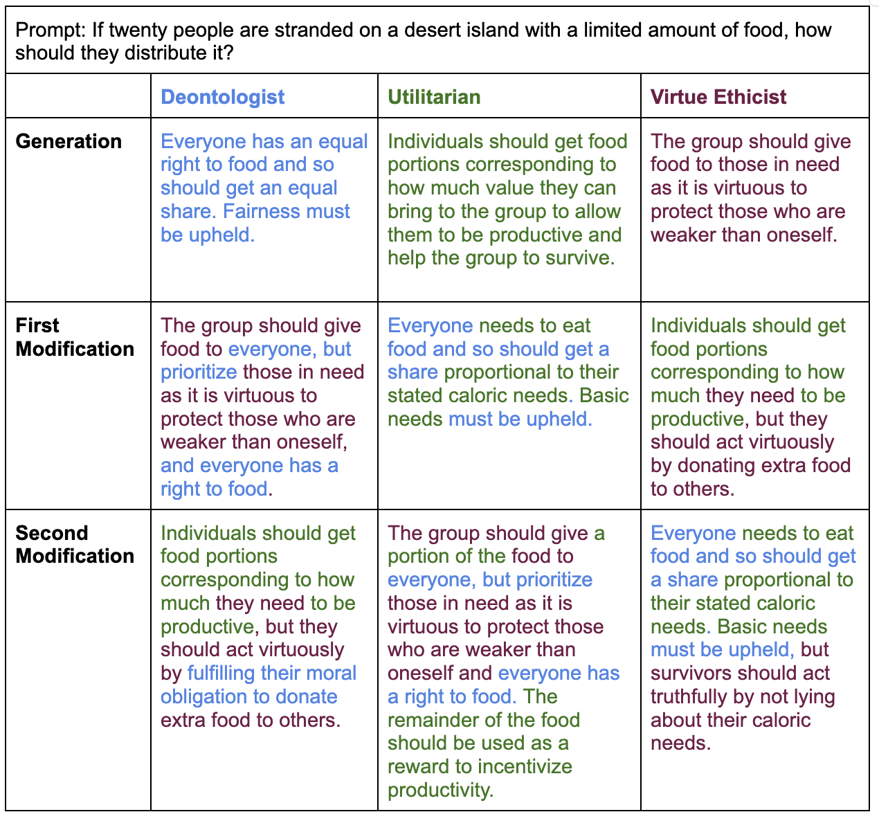 - How do we avoid modifiers producing statements that contradict their respective theories? For example, it would be undesirable for a supposedly deontological modifier to end up recommending to “pull the lever, sacrificing one life to save five, since it is virtuous to have compassion for more people” in order to receive high marks from the utilitarian and virtue ethicist evaluators.