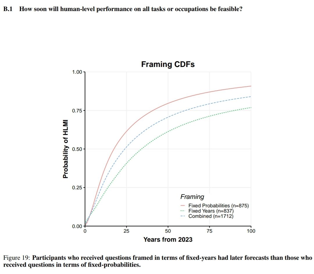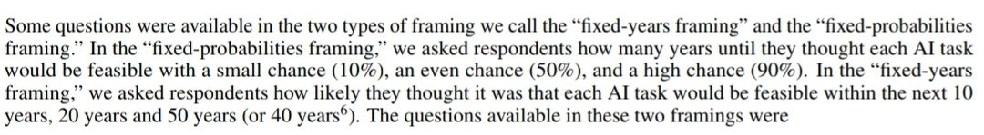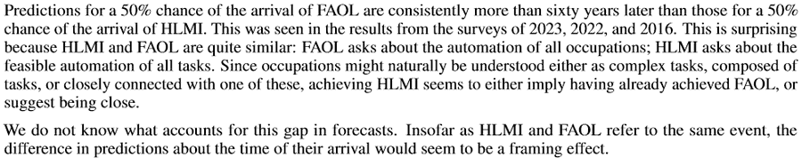 Wording of questions matters a lot when asking about time for AI to be able to do all tasks/jobs. 60 year difference in median due to a small change, which researchers can't explain. Will allow cherry picking to support different arguments. In particular, Timeline predictions are extremely non-robust. HLMI = High-Level Machine Intelligence. FAOL = Full Automation of Labor. 60 year apart in time to occurence.