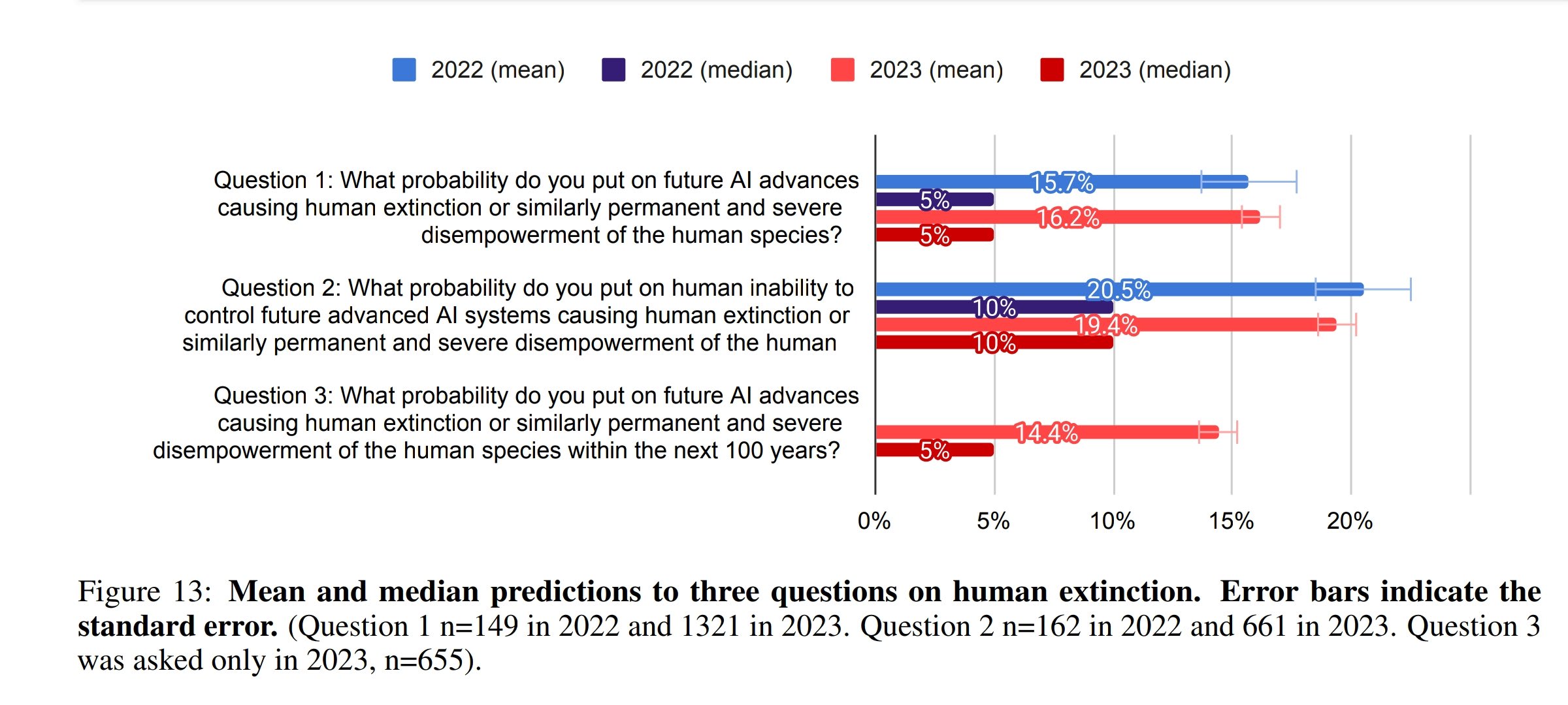 3. Median respondents put 5% or more on advanced AI leading to human extinction or similar, and a third to a half of participants gave 10% or more. This was across four questions, one about overall value of the future and three more directly about extinction.