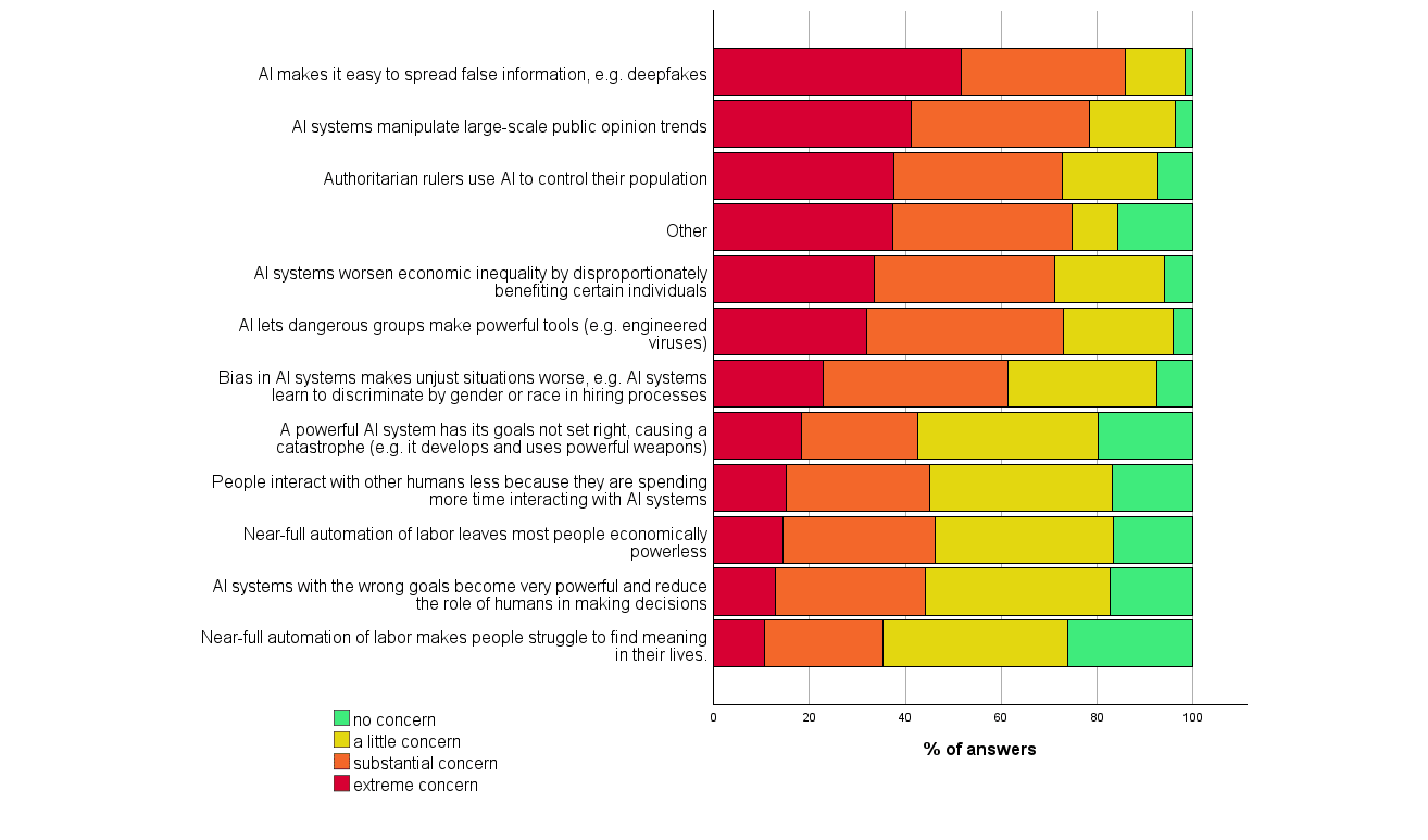 I think the main takeaway w.r.t. risk is that typical researchers in ML (like most of the public) have not thought about impacts of AI very seriously but their intuitive reaction is that a range of negative outcomes are plausible. They are particularly concerned about some impacts (like misinformation), particularly unconcerned about others (like loss of meaning), and are more ambivalent about others (like loss of control).