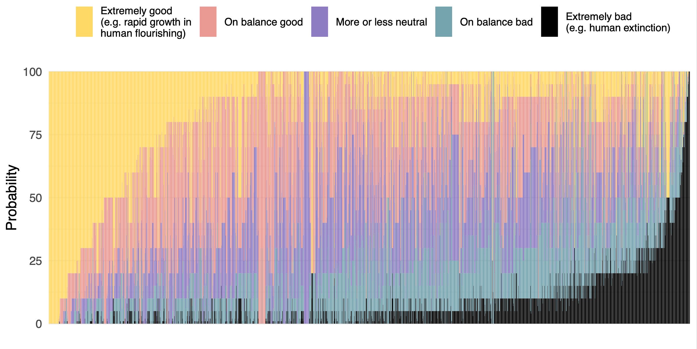 5. There are few confident optimists or pessimists about advanced AI: high hopes and dire concerns are usually found together. 68% of participants who thought HLMI was more likely to lead to good outcomes than bad, but nearly half of these people put at least 5% on extremely bad outcomes such as human extinction, and 59% of net pessimists gave 5% or more to extremely good outcomes.