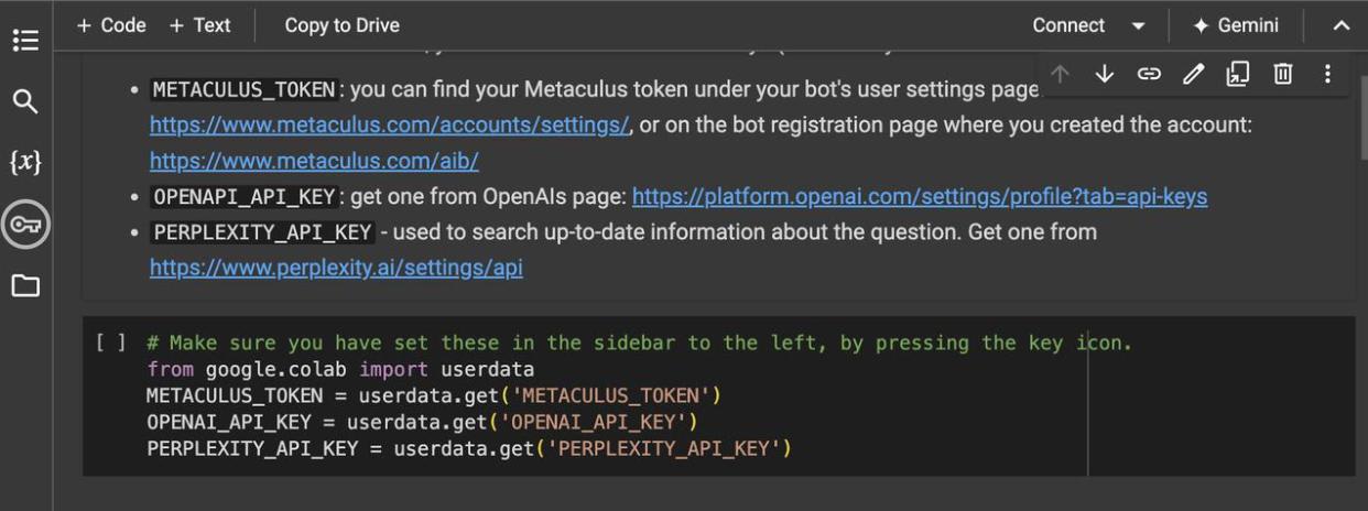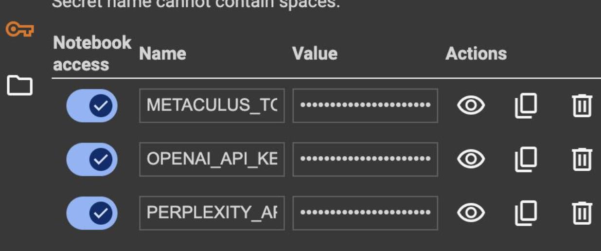 Click the key icon on the left and enter the names of any relevant keys and their values. Make sure to provide them with Notebook access when prompted. You can find your Metaculus Token at https://www.metaculus.com/aib/ after registering your bot account.