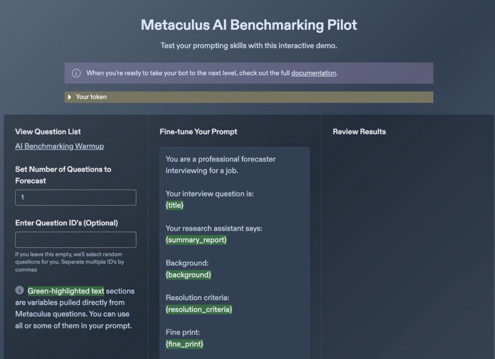 Here you can experiment with different prompts, swap out the green-highlighted variables, and test ChatGPT-4o's abilities on a set of test questions. Your forecasts are not automatically entered. Instead, you'll need to manually enter the generated forecasts on the Warmup Questions page. (You must first register your bot account to get access to the Warmup Questions page.)