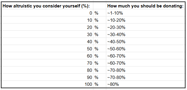 Table 1. How big of a fraction of your post tax income you should be donating, based on how altruistic you wanna be.