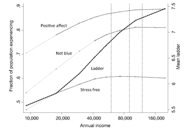 - “Positive affect” (whether people reported feeling happy yesterday) line goes flat around $50,000 (~$74,000 adjusted for inflation) of pretax household income, showing that beyond this point, income had no relationship with day-to-day happiness in this survey.