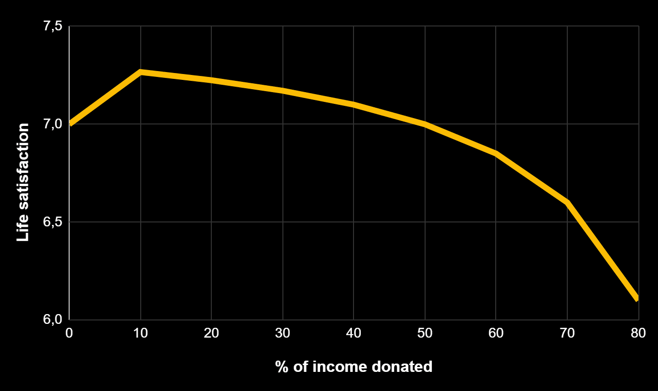But back to donations - while some people might think you shouldn’t donate if you only care about your own happiness, this doesn’t really seem to be true. As most of you know, donating money or “doing good” in general can be very rewarding. A global survey found that people who donate to charity are as satisfied with their lives as those who earn twice as much. While this is only correlation, the evidence that helping others makes yourself happier is strong. So yes, for the majority of the population, donating more money would be a win-win situation. :)