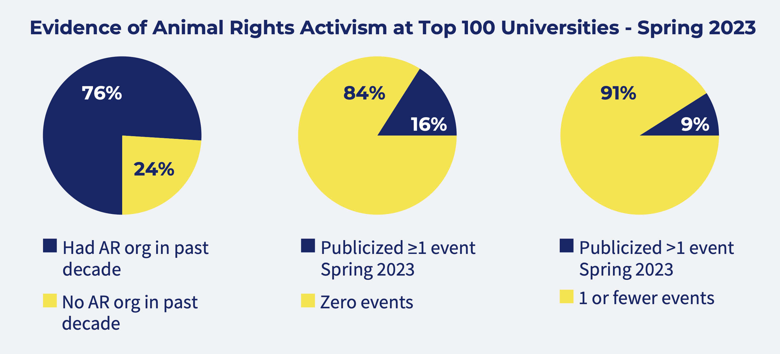 - Most college animal advocacy organizations are inactive, indicating a lack of sustainability. While 76% of top colleges once had active animal rights organizations, fewer than 20% of colleges are currently active, and fewer than 10% held more than a single event in the first five months of 2023.