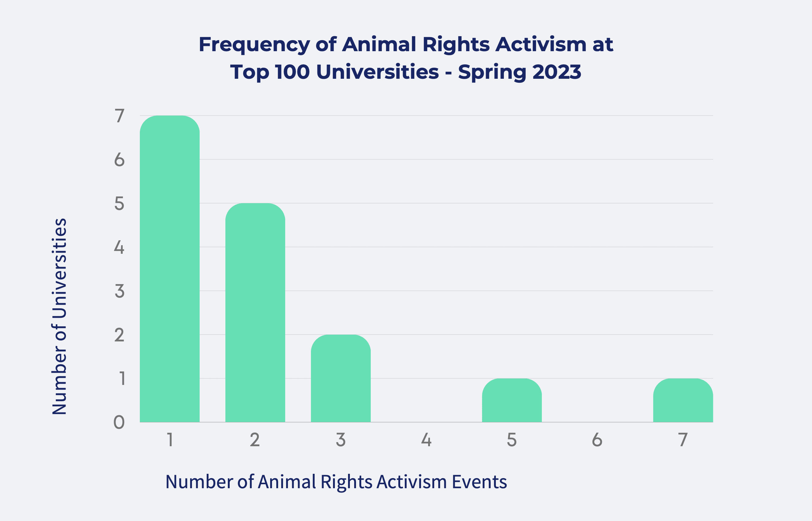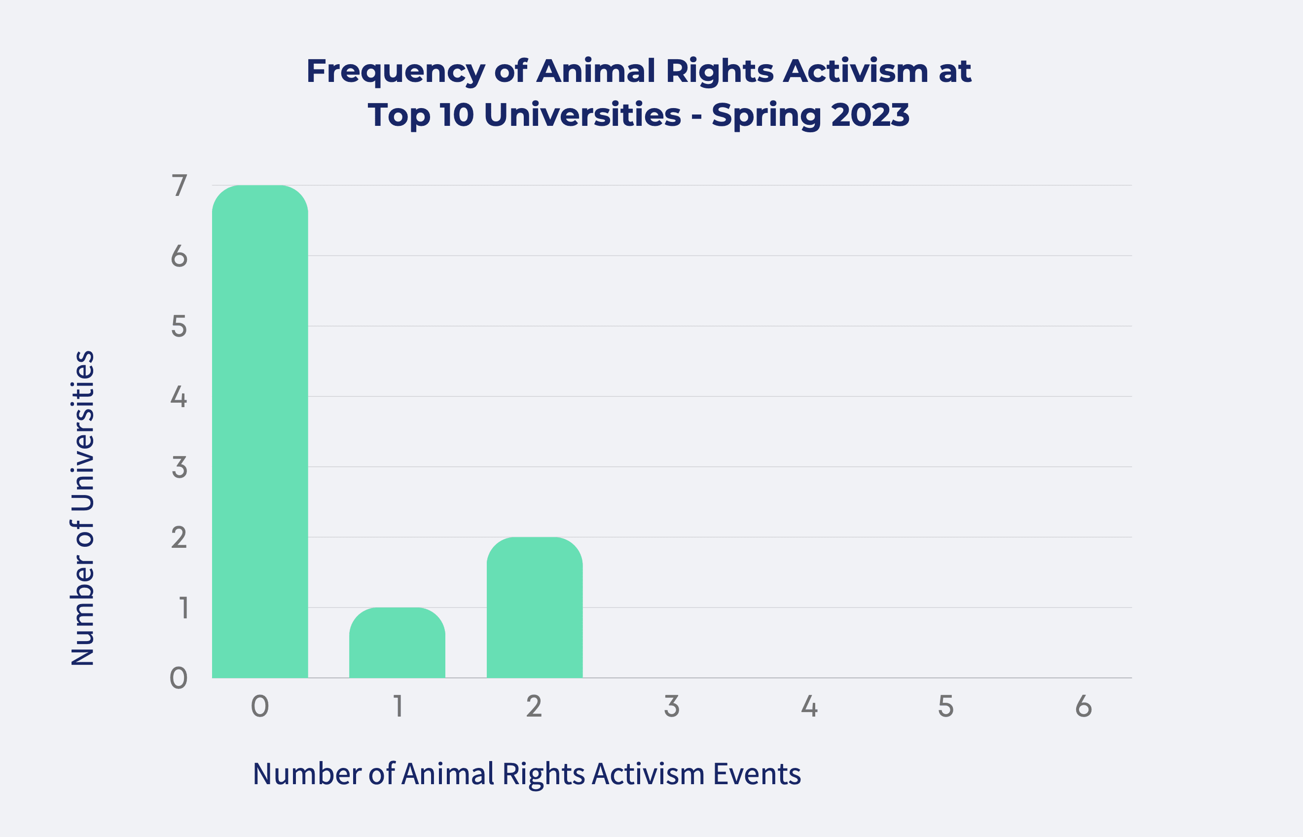 Focusing again on the top 10 universities: Seven had no animal rights activism events, one held a single event, and two held two events. None of the top 10 American universities held more than two animal advocacy events between January and May 2023.