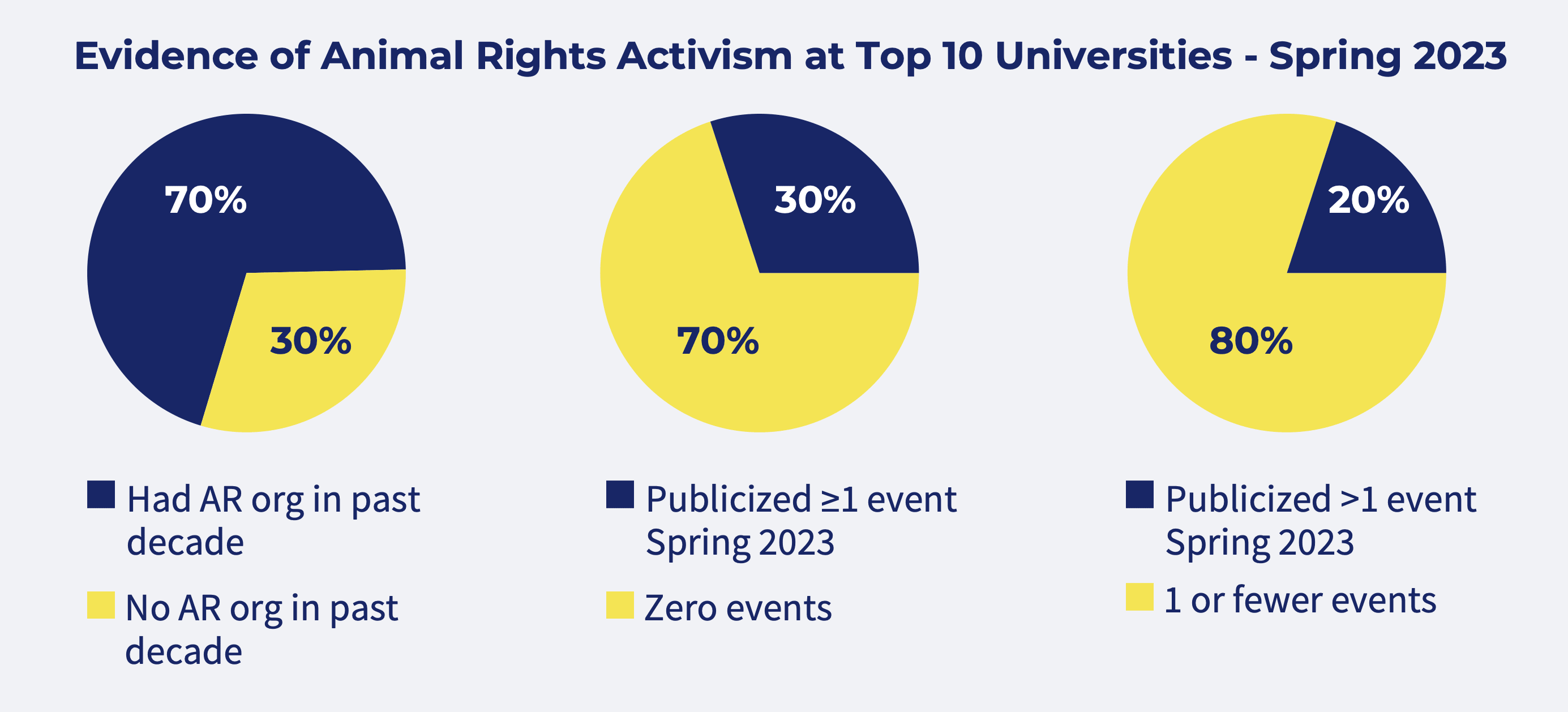 - The top 10 universities are similarly inactive and are even less effective. Of these, 70% saw no animal rights activism, and none held more than two events in Spring 2023.