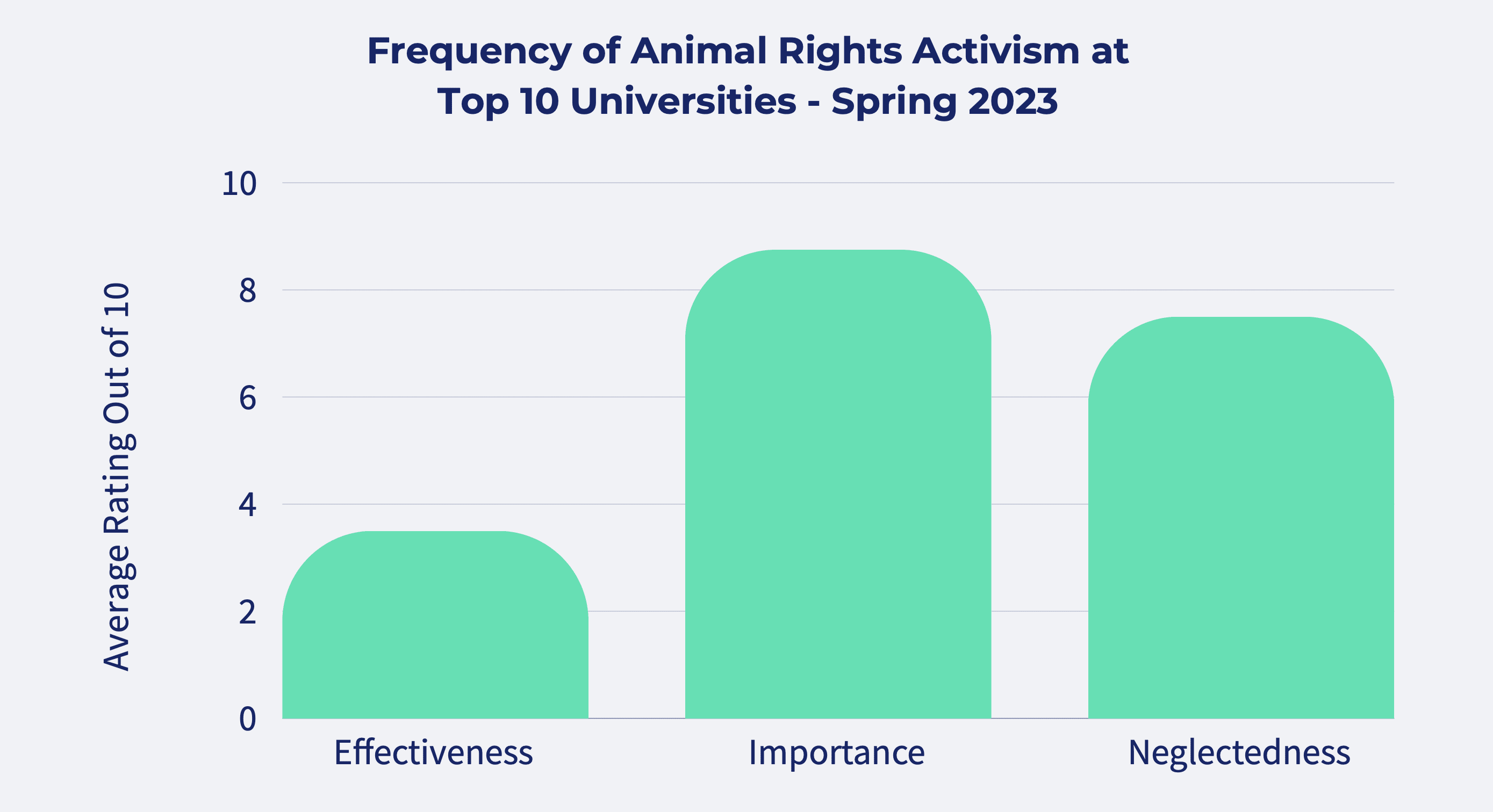 Similarly, all but one respondent rated the current effectiveness of campus Animal Rights activism as below 5 on a scale of 1 to 10, with 10 being most effective. We also asked respondents to rate the importance and neglectedness of campus advocacy on a scale of 1 to 10, with 10 being the most important/neglected. On average, respondents rated its importance at 9/10, and neglectedness at 7.5/10.