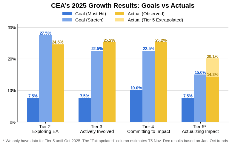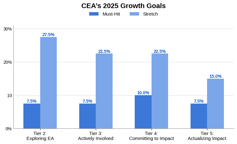 At the start of the year, we built a model to measure the growth in the number of people who engage with CEA programs at different tiers of engagement (from “Exploring EA” to “Actualizing Impact”). Using this model, we set targets of 7.5–10% growth across all tiers in 2025.