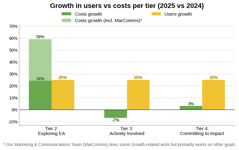 - Cost growth: For each growth-generating program (e.g. the EA Newsletter, EAGx events), we estimate how much the program cost in 2025 vs 2024, in some cases making simplifying assumptions. We then apportion the costs for each program to the tier(s) this program contributes to (e.g. EA Newsletter costs are allocated to Tier 2).