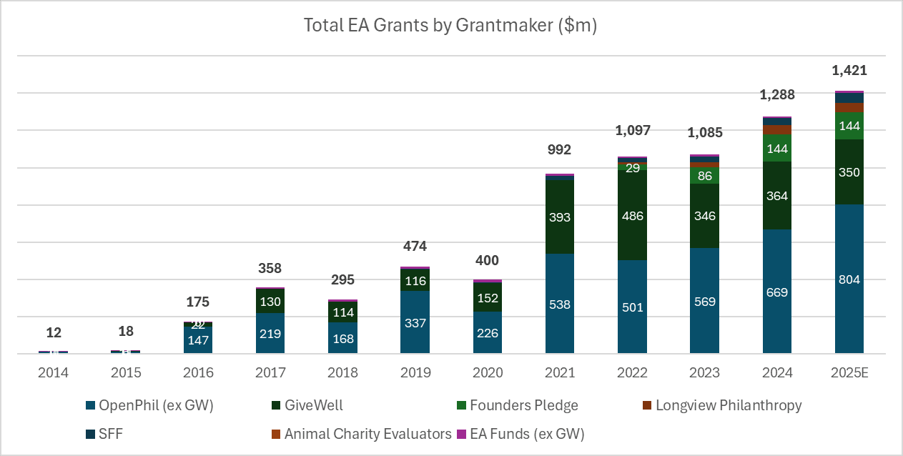 - Updated OpenPhil figures for 2024 and 2025 to align with this, better reflecting won't-be-published and yet-to-be-published grants (note this means they are really not comparable with earlier years)