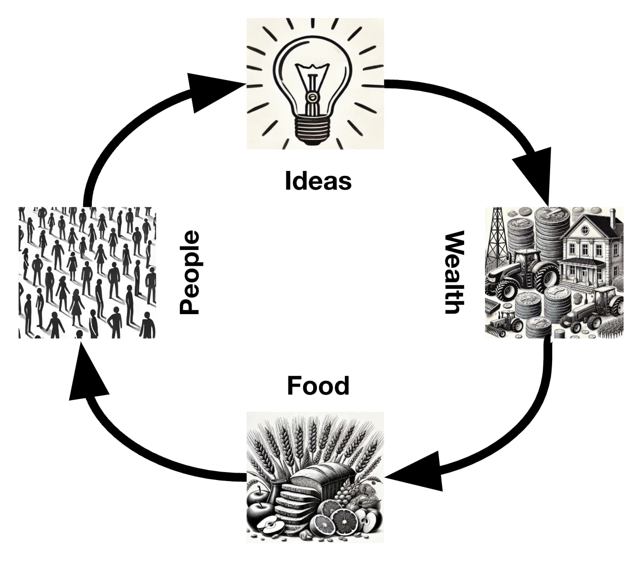 In particular, AIs help de-risk one of the largest current risks to future human progress. One model of the feedback loop behind humanity’s progress in the past few centuries is that people led to ideas led to wealth led to food led to more people.