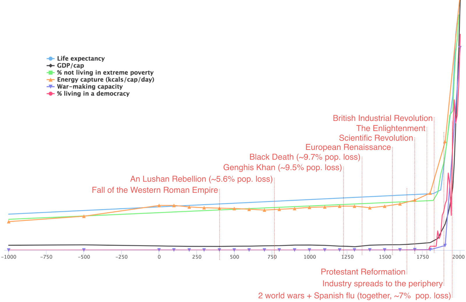 Above: variables correlated with human well-being over time. Source: Luke Muehlhauser
