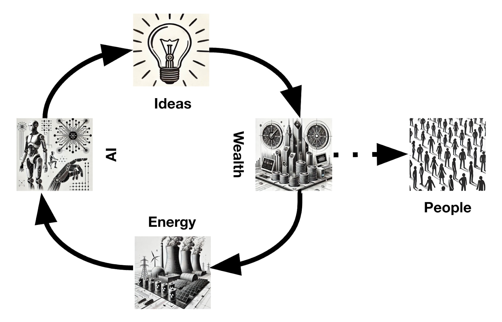 However, greater wealth no longer translates into more people. The world population, which was exponentially growing for much of the 19th and 20th centuries, is likely to be in decline by the end of the 21st century. This is likely to have negative consequences for the rate of innovation, and as discussed in the next section, a decline in productivity would likely have a negative impact on human wellbeing. However, if AIs start driving innovation, then we have a new feedback loop: wealth leads to energy leads to more AIs leads to ideas leads to wealth.