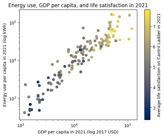 Above: GDP per capita (x-axis), energy use (y-axis), and life satisfaction (colour scale) for 142 countries. There are no poor countries with high energy use, and no high energy use countries that are poor. There are no countries with high average life satisfaction that are not high in both energy use and average GDP per capita. The axes are logarithmic, but since economic growth is exponential, countries should be able to make progress at a constant rate along the axis. Data source: Our World In Data (here, here, and here).[1]