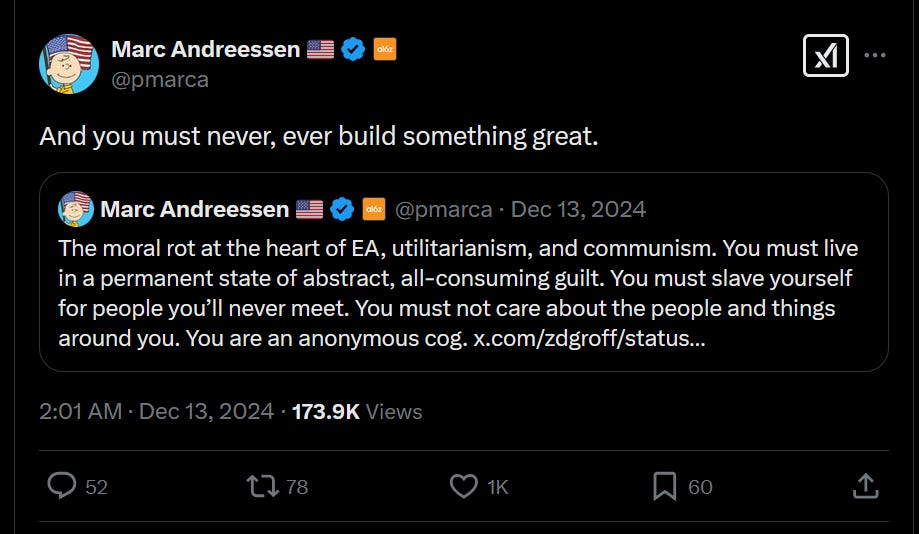 We can all think of nonaltruistically ambitious people. Certainly Marc Andreessen does—he’s a venture capitalist. A founder who isn’t content until she has a unicorn startup, and then once it IPOs turns around and starts another one. A chess player trying to become a grandmaster—or a speedrunner trying to set a world record. A novelist who is constantly honing her craft. A lawyer who puts in hundred-hour weeks trying to make partner. A small business owner who plans to pass along her landscaping business to her children. A grad student who sacrifices her twenties to writing about the diets of tanners in 16th century Flanders.