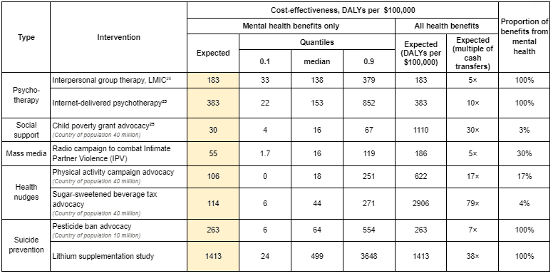 Here we provide estimates of the cost-effectiveness of various mental health interventions. These should be considered as preliminary “best guesses”, as most of the inputs are either subjective estimates or are taken from others’ analyses.