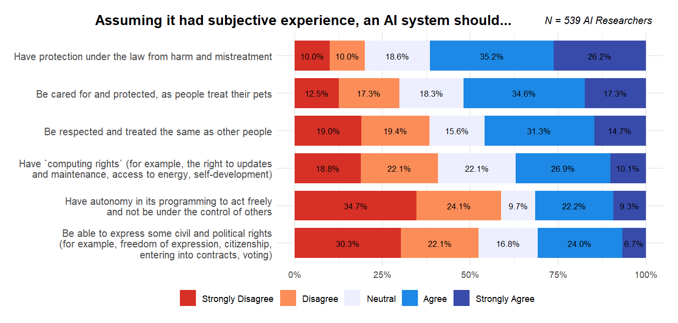 My colleagues and I recently conducted a survey on AI sentience with both AI researchers and the US public. In one question, we asked participants what protection AI systems should receive, assuming they had subjective experience. The figures below show that both groups had wide internal disagreements. People’s views will likely change in the future, but these findings show that the basis for disagreement is already present.