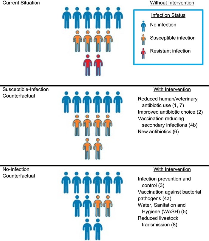 Infographic illustrating the difference between attributable disease burden, defined using the susceptible-infection counterfactual, and associated disease burden, defined using the no-infection counterfactual. Both measures are relevant in the AMR context for different policy-relevant scenarios. Source: Burden of Antimicrobial Resistance: Compared to What? by Marlieke E A de Kraker and Marc Lipsitch