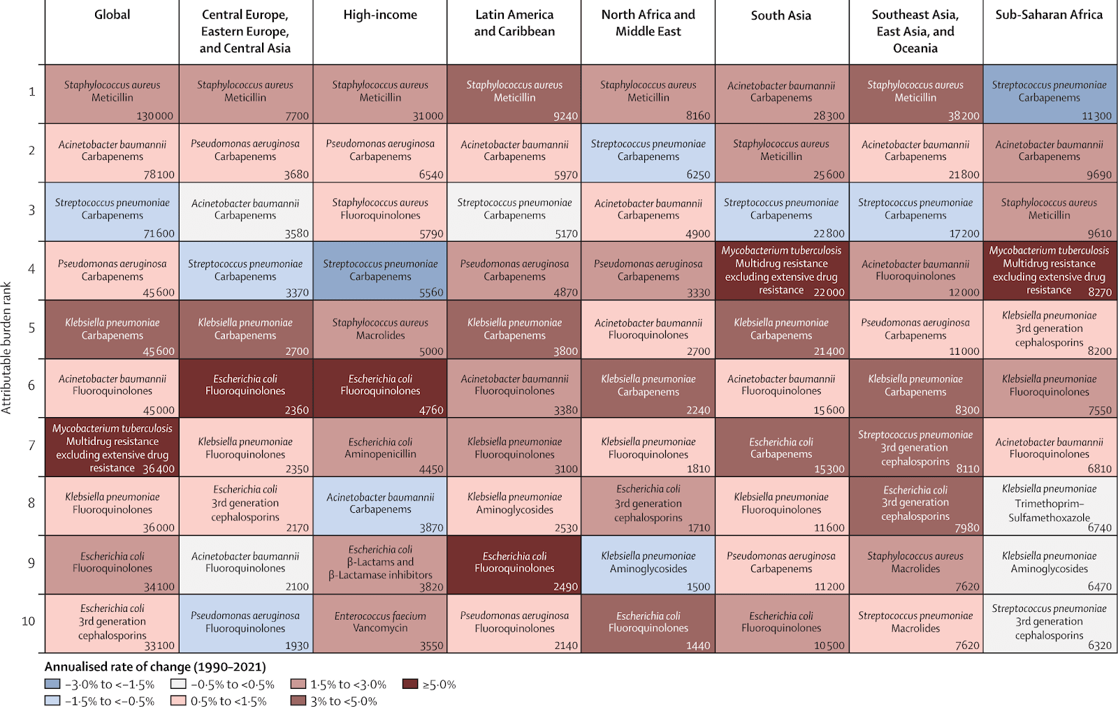 Methicillin-resistant Staph aureus (MRSA) was the deadliest pathogen-drug resistance combination in most world super regions, with multiple carbapenem-resistant organisms (CPOs) close behind. The latter are particularly concerning given that carbapenems are considered to be a last-resort antibiotic. Figure from the new Lancet study