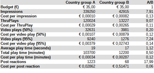 To test this, I promoted this video: https://fb.watch/oqPsFPF0Ut/ in two groups of countries. (Thank you to Kinder World for allowing me to use their video for this test!)