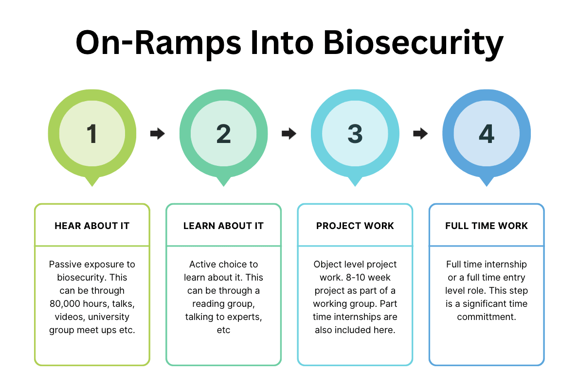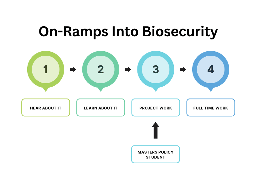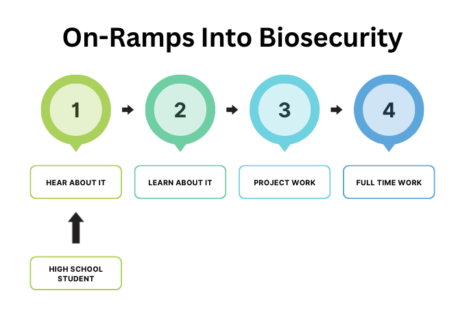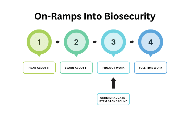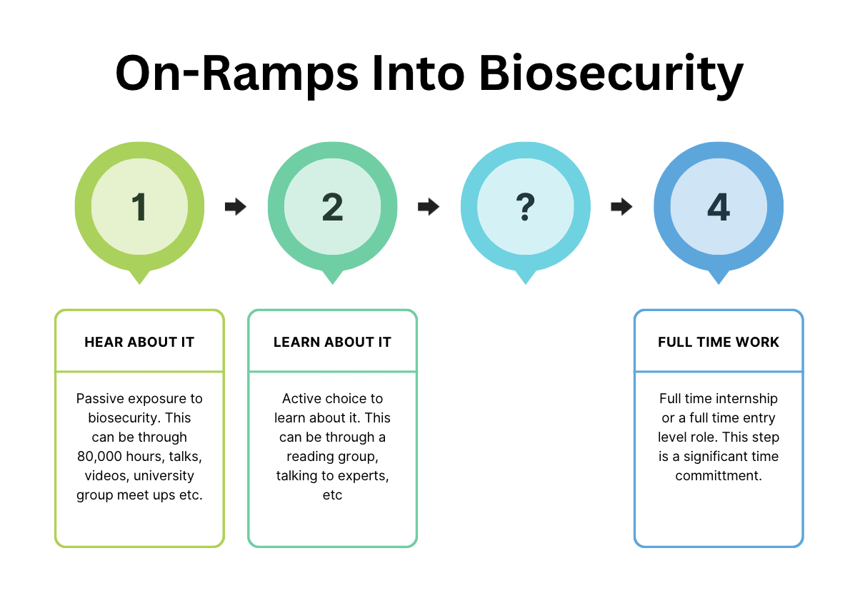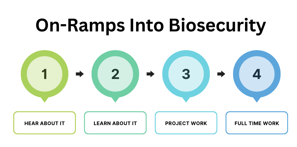 - I propose a model to think about on-ramps into biosecurity & provide a few use cases for it depending on the background you are coming in with.