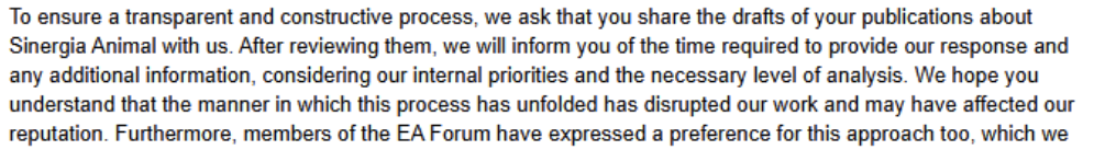 Basically reasonable, though "We do plan to eventually release full responses to ACE and Sinergia's responses. In order to respect ACE and Sinergia's wishes, we will show this response to both of you at least 24 hours before publishing (or more if you would prefer)." shows less understanding of how organizations work than I'd like to see from a charity evaluator, even a volunteer-run group. Better would be (a) default to an amount of time where the organization could plausibly review and respond without dropping everything, probably a week, (b) give more indication about when this might come than "eventually", and (c) clarify up front whether Vetted Causes is willing to engage in back-and-forth to improve the draft or whether they're just giving Sinergia the ability to prepare a public response.