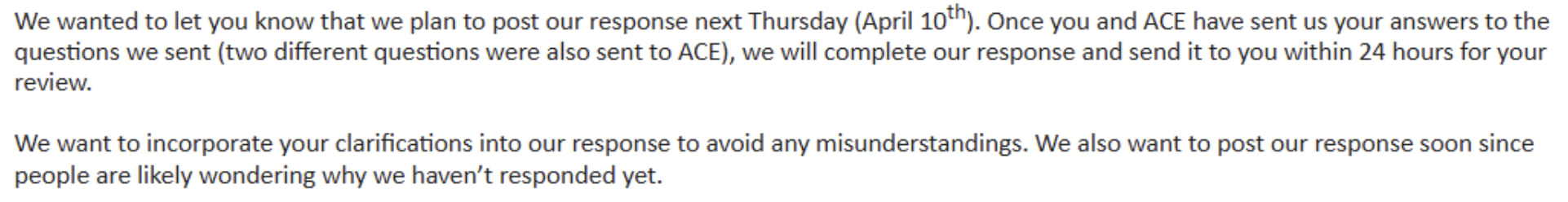 We wanted to let you know that we plan to post [______] next Thursday (April 10th). Once [_____] have sent us your answers to the questions we sent (two different questions were also sent to [______]), we will complete our response and send it to you within 24 hours for your review.