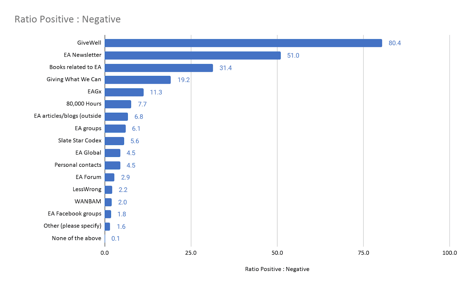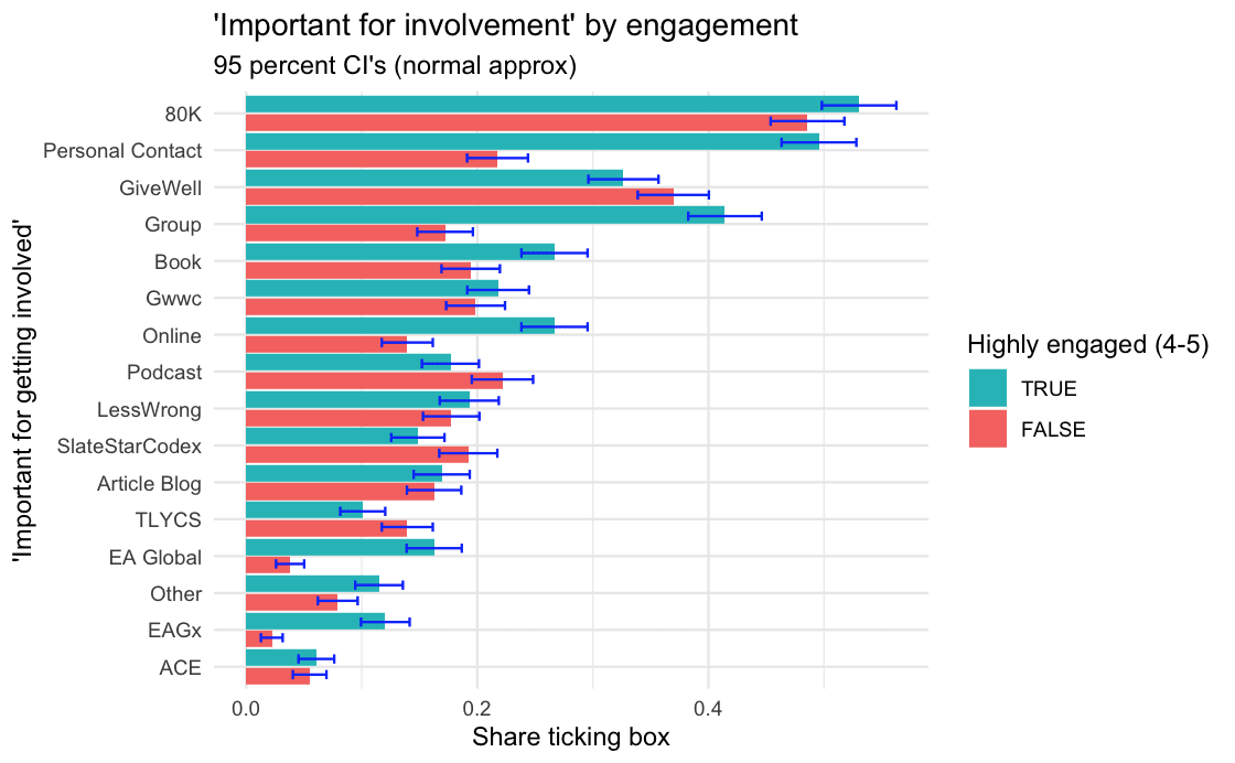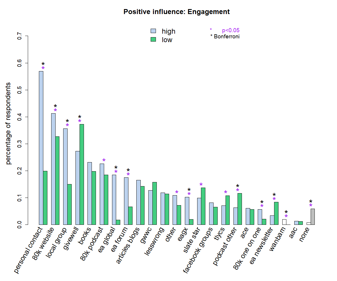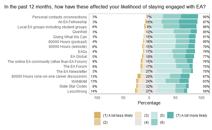 - Notwithstanding the negative Forum articles you link, EA groups are not cited particularly often as a negative influence on people’s involvement in EA (6.5% of respondents, similar to the EA Forum and a lower absolute percentage than personal contacts or 80K [bear in mind that the absolute percentage of people selecting a factor may simply reflect the fact that lots of people have encountered it]). Its ratio for positive:negative influence is not particularly poor (less good than 80K, but better than personal contacts)